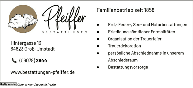 Die Adresse von Beerdigungen Pfeiffer lautet: Hintergasse 13, 64823 Groß-Umstadt