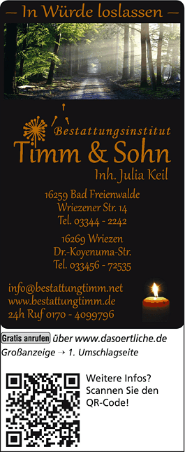 Die Adresse von Beerdigungsinstitut Timm lautet: Wriezener Str. 14, 16259 Bad Freienwalde (Oder)