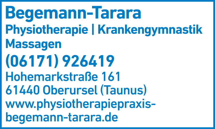 Die Adresse von Begemann-Tarara Krankengymnastikkpraxis lautet: Hohemarkstr. 161, 61440 Oberursel (Taunus)