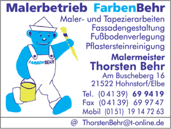 Behr Thorsten bietet Malermeister, Malerbetrieb, Tapezierarbeiten, Maler- und Tapezierarbeiten, Fassadengestaltung, Fußbodenverlegung und Pflastersteinreinigung an.