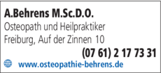 Die Adresse von Behrens M.Sc..O. Andreas lautet: Auf der Zinnen 10, 79098 Freiburg