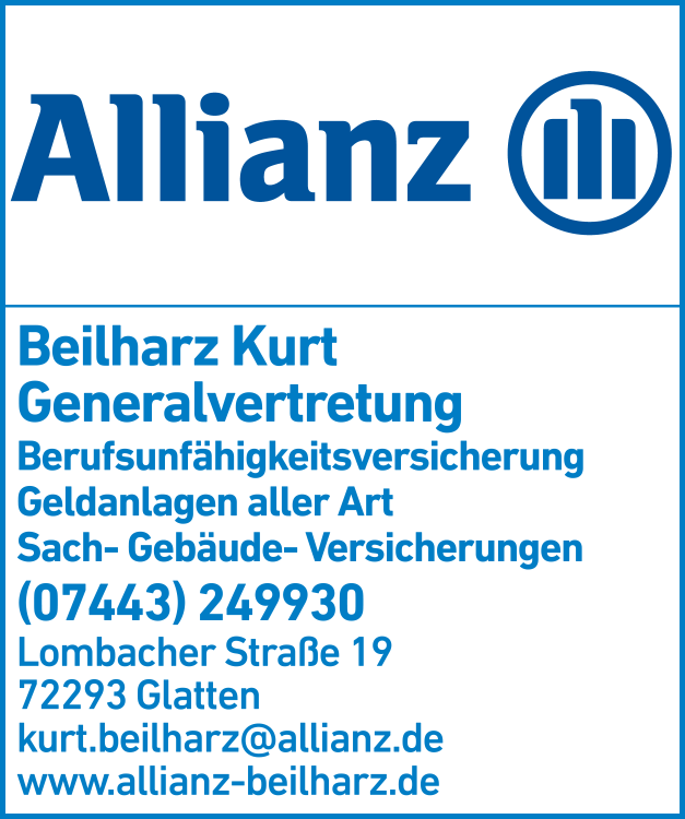 Die Adresse von Beilharz Kurt Allianz Generalvertretung Versicherungen lautet: Lombacher Str. 19, 72293 Glatten