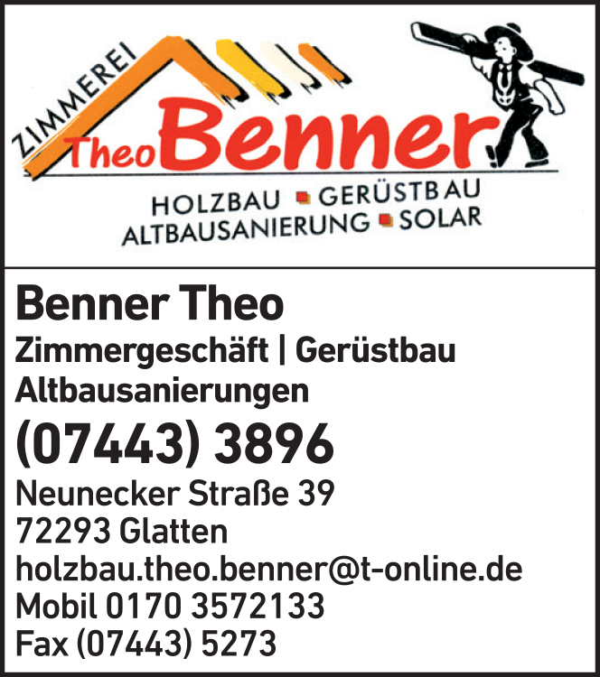 Die Adresse von Benner Theo Zimmerei lautet: Neunecker Str. 39, 72293 Glatten