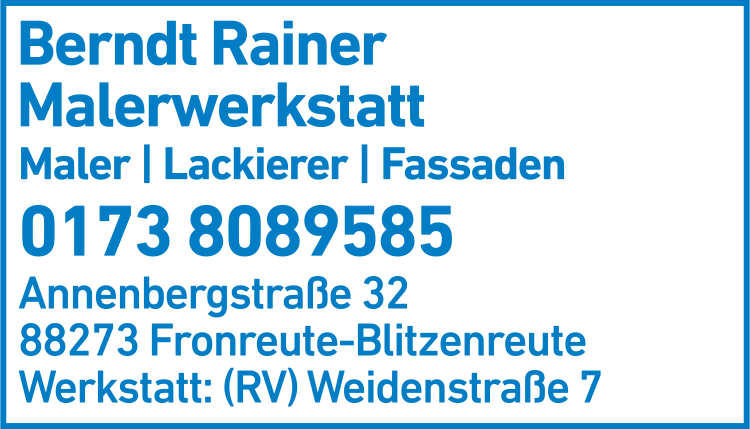 Die Adresse von Berndt Rainer Malerwerkstatt lautet: Annenbergstr. 32, 88273 Fronreute-Blitzenreute