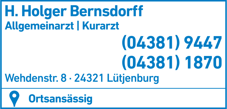 Die Adresse von Bernsdorff H. Holger Allgemeinarzt lautet: Wehdenstr. 8, 24321 Lütjenburg