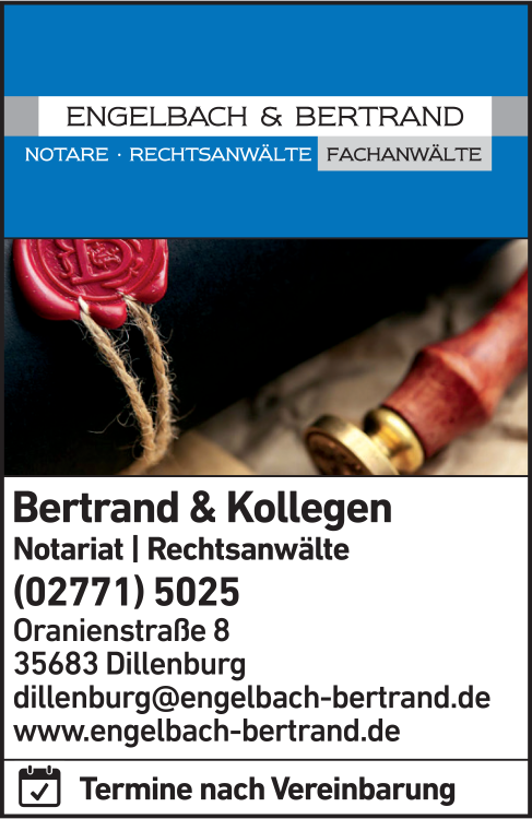 Die Adresse von Bertrand Robert Rechtsanwalts- und Notarkanzlei lautet: Oranienstr. 8, 35683 Dillenburg