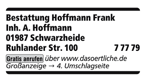 Die Adresse von Bestattung Hoffmann Frank Inh. A. Hoffmann lautet: Ruhlander Str. 100, 01987 Schwarzheide
