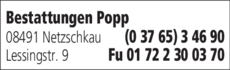 Die Adresse von Bestattungen Popp lautet: Lessingstr. 9, 08491 Netzschkau