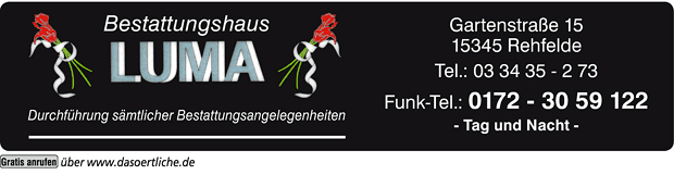 Die Adresse von Bestattungshaus LUMA lautet: Gartenstr. 15, 15345 Rehfelde