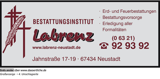 Die Adresse von Bestattungsinstitut Labrenz lautet: Jahnstr. 17-19, 67434 Neustadt an der Weinstraße
