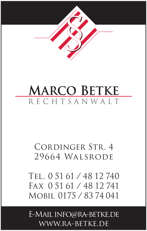Die Adresse von Betke Marco Rechtsanwalt lautet: Cordinger Str. 4, 29664 Walsrode