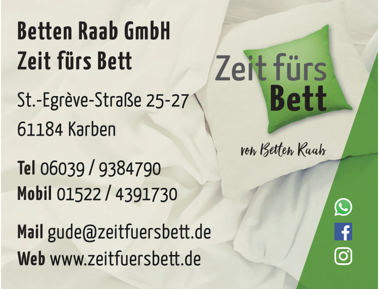 Betten Raab GmbH Zeit für's Bett Bettenfachgeschäft & Schlafberatung 06039 9 38 47 90 Karben St.-Egrève-Str. 25-27 61184 Groß-Karben de.teleauskunft.oetb.webapp2.detail.Graphic@188feccc