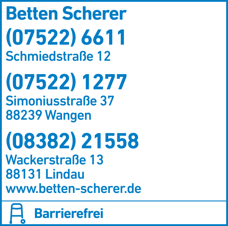 Die Adresse von Betten Scherer Inh. Sebastian Scherer lautet: Schmiedstr. 12, 88239 Wangen