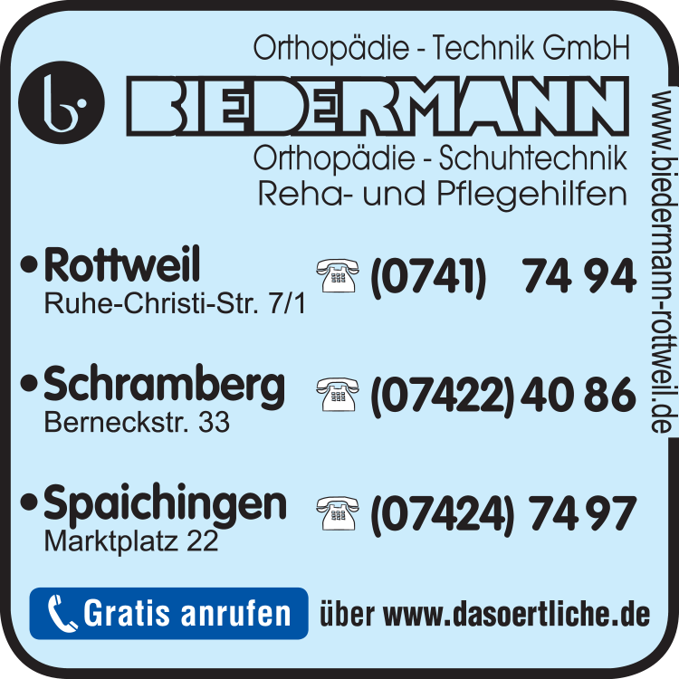 Die Adresse von Biedermann Orthopädie-Technik GmbH lautet: Ruhe-Christi-Str. 7/1, 78628 Rottweil