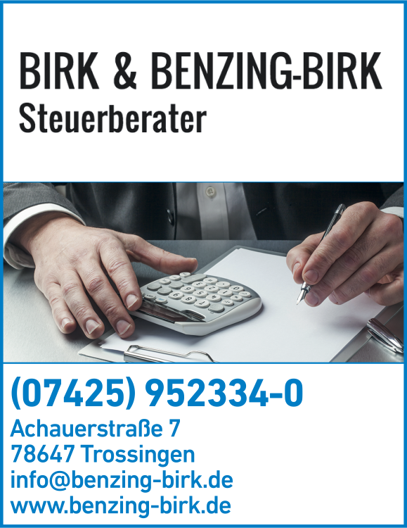 Die Adresse von Birk + Benzing-Birk Steuerberatung lautet: Achauerstr. 7, 78647 Trossingen