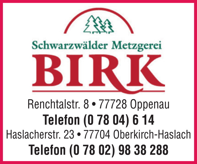 Birk Christian Schwarzwälder Metzgerei 07802 9 83 82 88 Oberkirch Haslacher Str. 23 77704 Haslach