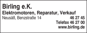 Die Adresse von Birling e.K. Elektromotoren lautet: Benzstr. 14, 86356 Neusäß