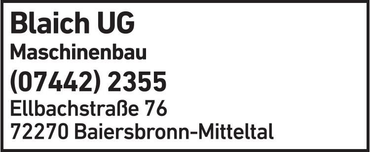 Die Adresse von Blaich UG Maschinenbauservice lautet: Ellbachstr. 76, 72270 Baiersbronn