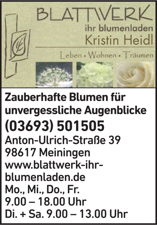 Die Adresse von Blattwerk - ihr blumenladen lautet: Anton-Ulrich-Str. 39, 98617 Meiningen