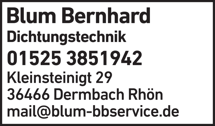Die Adresse von Blum Bernhard Dichtungstechnik lautet: Kleinsteinigt 29, 36466 Dermbach
