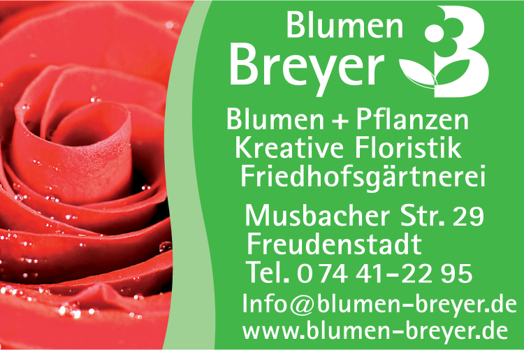 Die Adresse von Blumen Breyer lautet: Musbacher Str. 29, 72250 Freudenstadt