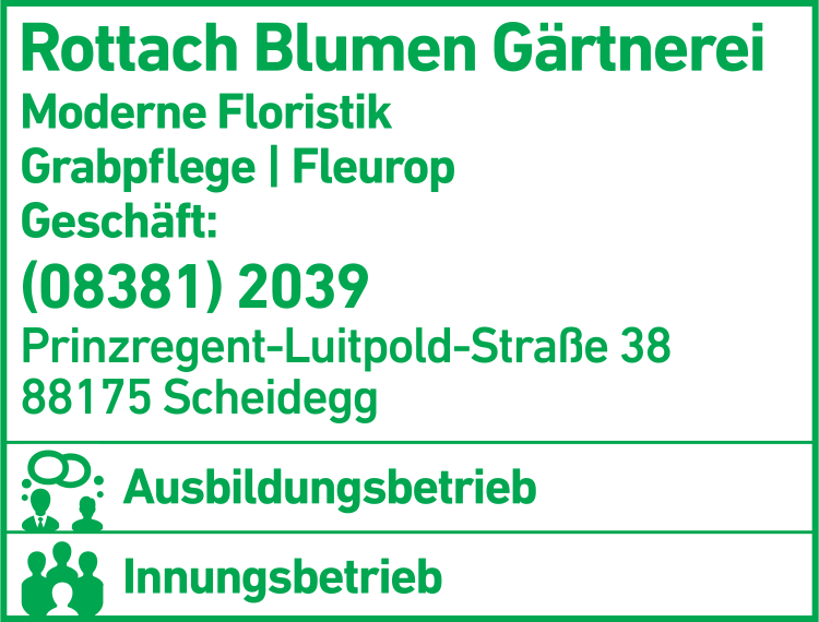Die Adresse von Blumen Rottach lautet: Prinzregent-Luitpold-Str. 38, 88175 Scheidegg