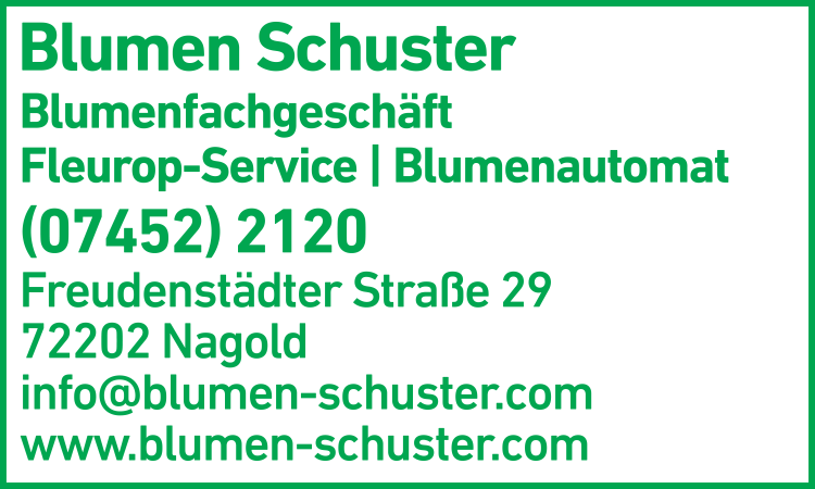 Blumen Schuster Blumenfachgeschäft 07452 21 20 Nagold Freudenstädter Str. 29 72202