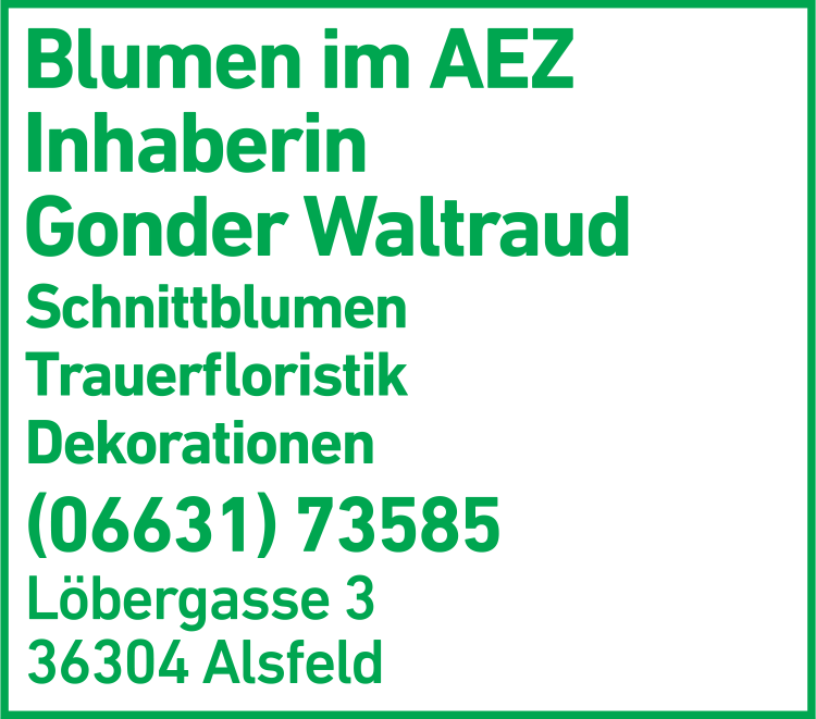 Die Adresse von Blumenabteilung im AEZ Gonder lautet: Löbergasse 3, 36304 Alsfeld