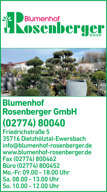 Blumenhof Rosenberger GmbH 02774 80 04-0 Dietzhölztal-Ewersbach Friedrichstr. 5 35716 Ewersbach de.teleauskunft.oetb.webapp2.detail.Graphic@8395be4 4 5 2