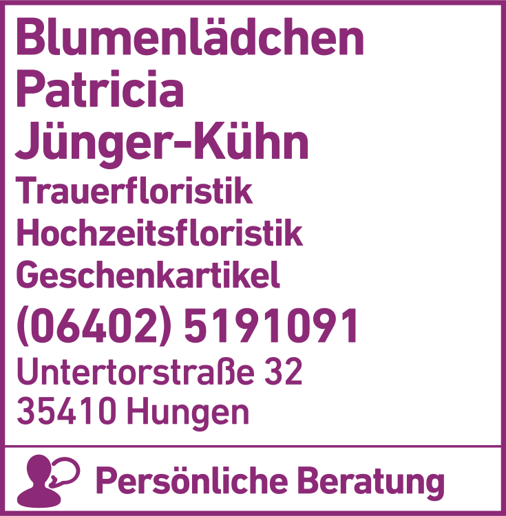 Die Adresse von Blumenlädchen Patricia Jünger-Kühn lautet: Untertorstr. 32, 35410 Hungen