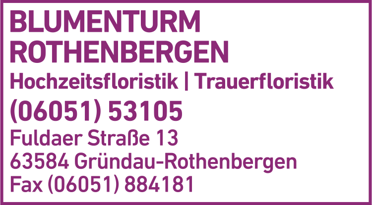 Blumenturm Rothenbergen Oliver Below 06051 5 31 05 Gründau Fuldaer Str. 13 63584 Rothenbergen