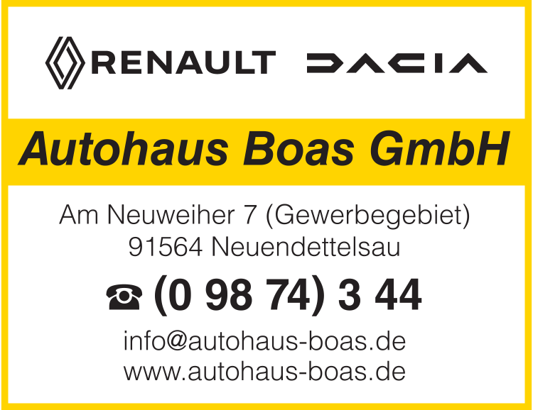 Die Adresse von Boas GmbH Autohaus lautet: Am Neuweiher 7, 91564 Neuendettelsau
