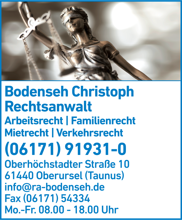 Die Adresse von Bodenseh Christoph Kanzlei lautet: Oberhöchstadter Str. 10, 61440 Oberursel (Taunus)