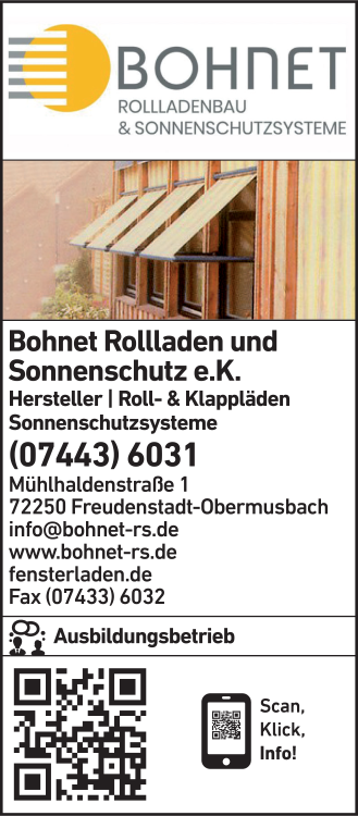 Die Adresse von Bohnet Rollladen und Sonnenschutz e.K. lautet: Mühlhaldenstr. 1, 72250 Freudenstadt