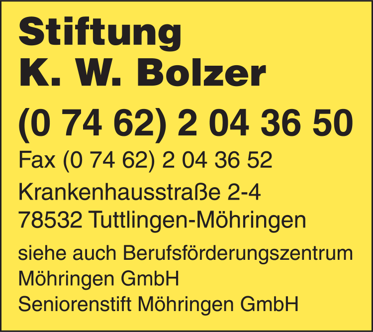 Die Adresse von Bolzer K. W. Stiftung lautet: Krankenhausstr. 2-4, 78532 Tuttlingen-Möhringen