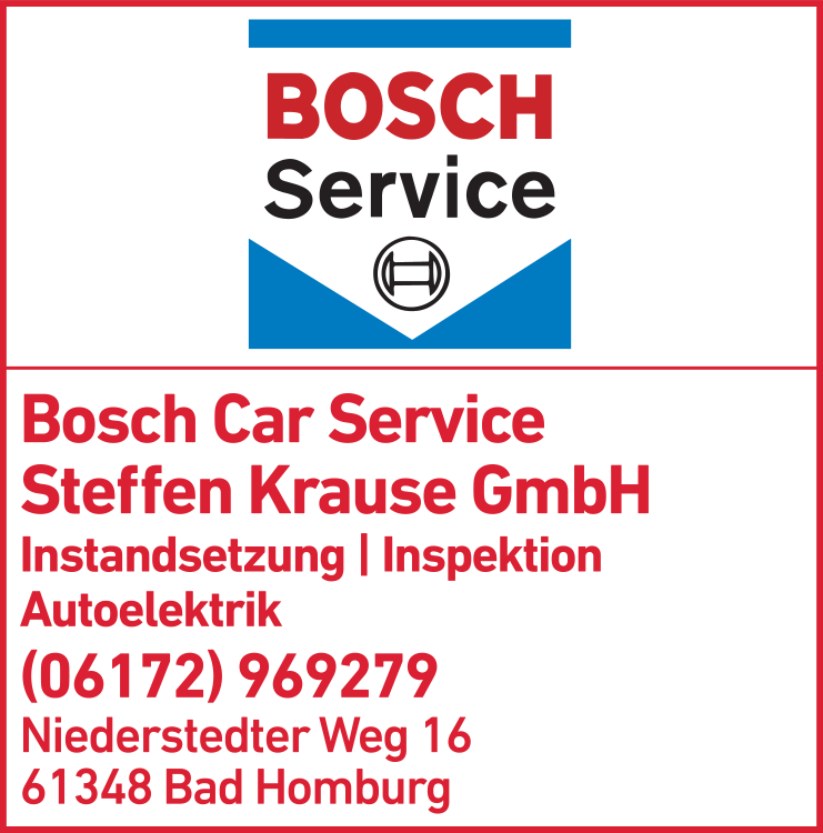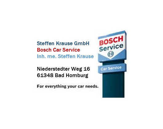 Die Adresse von Bosch Car Service Steffen Krause GmbH lautet: Niederstedter Weg 16, 61348 Bad Homburg