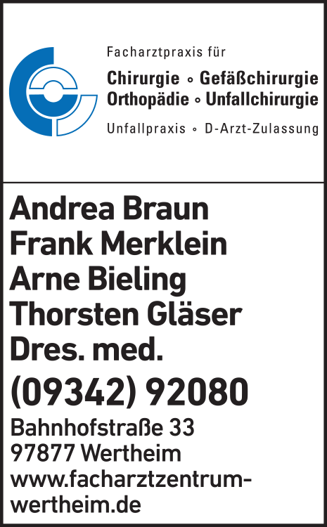 Braun A., Merklein F., Bieling A., Gläser Th. Dres. med. Facharztpraxis für Orthopädie, Chirurgie, Gefäßchirurgie, Unfallchi... 09342 92 08-0 Wertheim Bahnhofstr. 33 97877 5 5 1