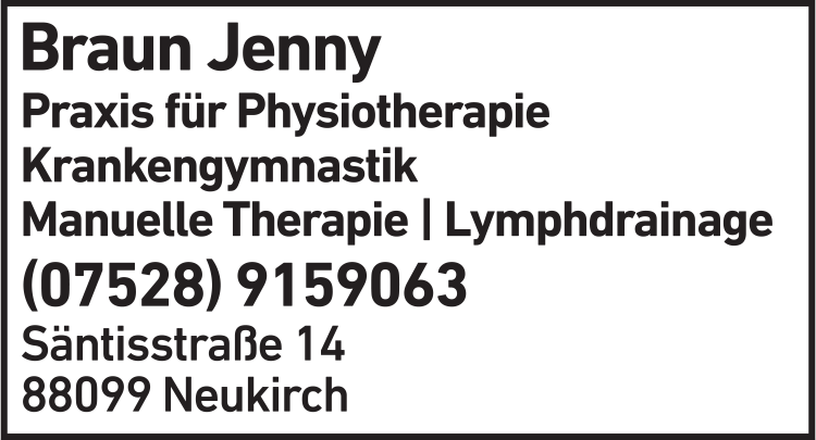 Die Adresse von Braun Jenny Praxis für Physiotherapie lautet: Säntisstr. 14, 88099 Neukirch