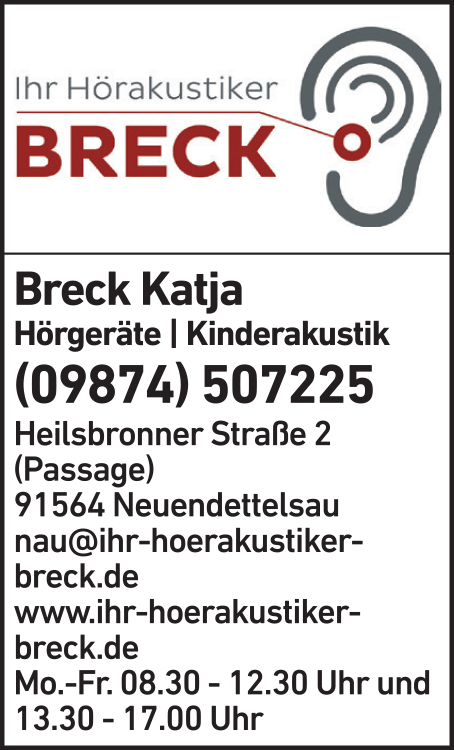 Die Adresse von Breck Hörakustiker lautet: Heilsbronner Str. 2, 91564 Neuendettelsau
