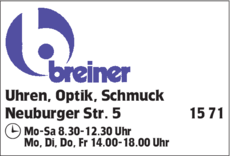 Die Adresse von Breiner, Uhren lautet: Neuburger Str. 5, 86653 Monheim
