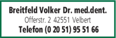 Die Adresse von Breitfeld Volker Dr. lautet: Offerstr. 2, 42551 Velbert