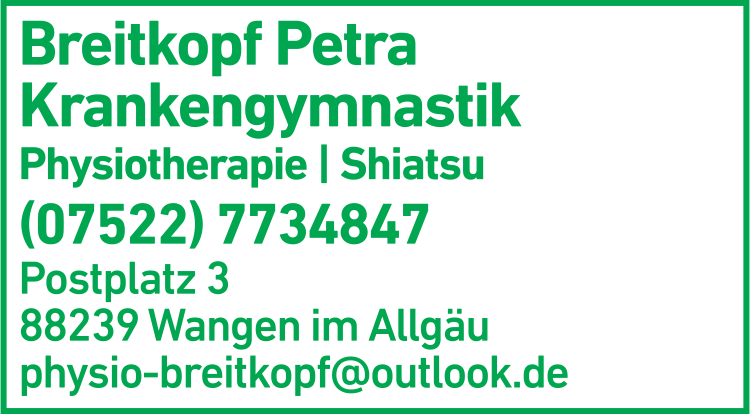 Die Adresse von Breitkopf Petra Krankengymnastik lautet: Postplatz 3, 88239 Wangen