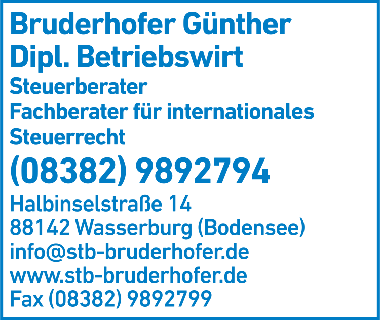 Bruderhofer Günther Dipl. - Betr.w. Steuerberater 08382 9 89 27 94 Wasserburg Halbinselstr. 14 88142 5 5 1