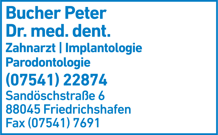 Die Adresse von Bucher Peter Dr. Zahnarzt lautet: Sandöschstr. 6, 88045 Friedrichshafen