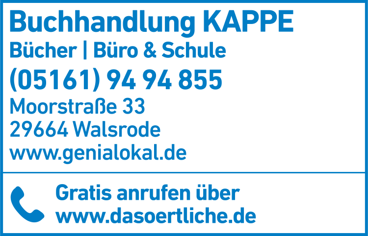 Die Adresse von Buchhandlung Kappe lautet: Moorstr. 33, 29664 Walsrode