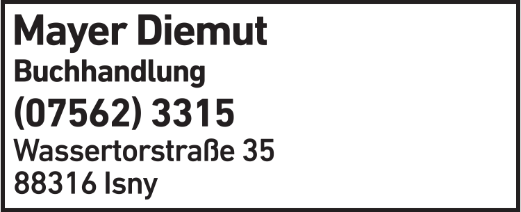 Die Adresse von Buchhandlung Mayer lautet: Wassertorstr. 35, 88316 Isny