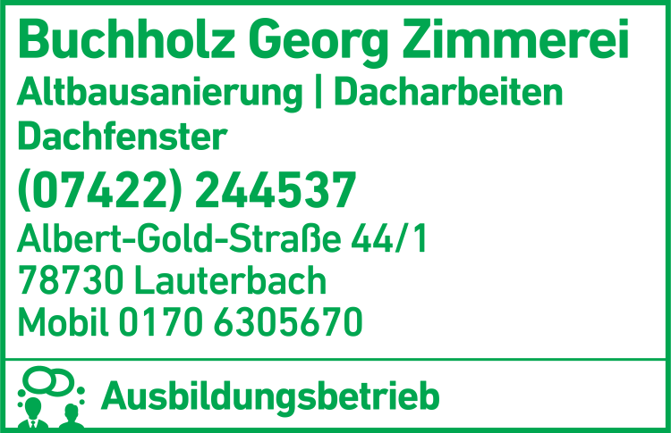 Die Adresse von Buchholz Georg Zimmerei lautet: Albert-Gold-Str. 44/1, 78730 Lauterbach