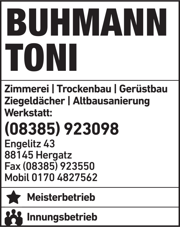 Die Adresse von Buhmann Anton Zimmerei lautet: Am Kirchberg 9, 88145 Hergatz-Wohmbrechts
