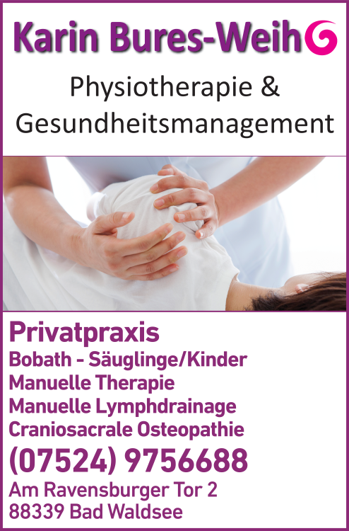 Die Adresse von Bures-Weih Karin Privatpraxis für Physiotherapie & Gesundheitsmanagement lautet: Am Ravensburger Tor 2, 88339 Bad Waldsee