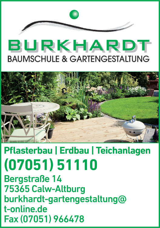 Die Adresse von Burkhardt GmbH Baumschule & Gartengestaltung lautet: Bergstr. 14, 75365 Calw